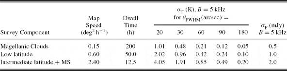 The long (~6 km) baselines, which give rise to synthesized beams at resolutions between 20'' and 30'' within the 30 deg2 FoV, coupled with the narrow spectral resolutions down to ~ 0.2 km s-1, will provide astronomers an unprecedented view of the neutral gas content the Milky Way (MW) and nearby Magallenic system. Over the allocated ~8000 hours, GASKAP will map up to +/-10 deg in Galactic latitudes over all Galactic longitudes, in addition to the two Magellanic Clouds (MCs), Bridge, and Stream (MS). See the figure and table below for a visual break down of the survey areas and summary of target surface brightness sensitivities (Dickey et al. 2013).
